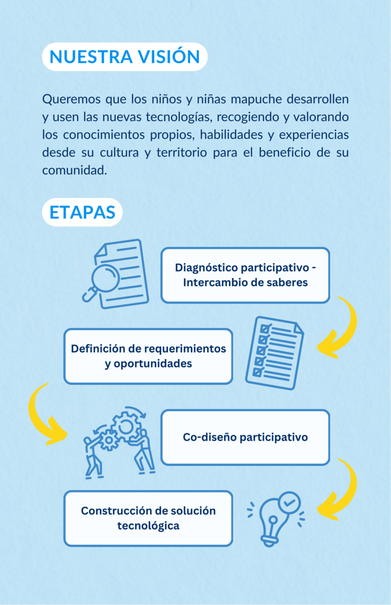 La hipótesis principal de esta propuesta es que el respeto e intercambio deconocimientos indígenas locales, con los conocimientos que provienen desde la ingeniería y ciencias, facilitan el co-diseño y aplicación de herramientas tecnológicas pertinentes a los contextos culturales y territoriales, lo cual asegura su sustentabilidad y permite un desarrollo educativo intercultural inclusivo, respetuoso y significativo para los/as estudiantes.